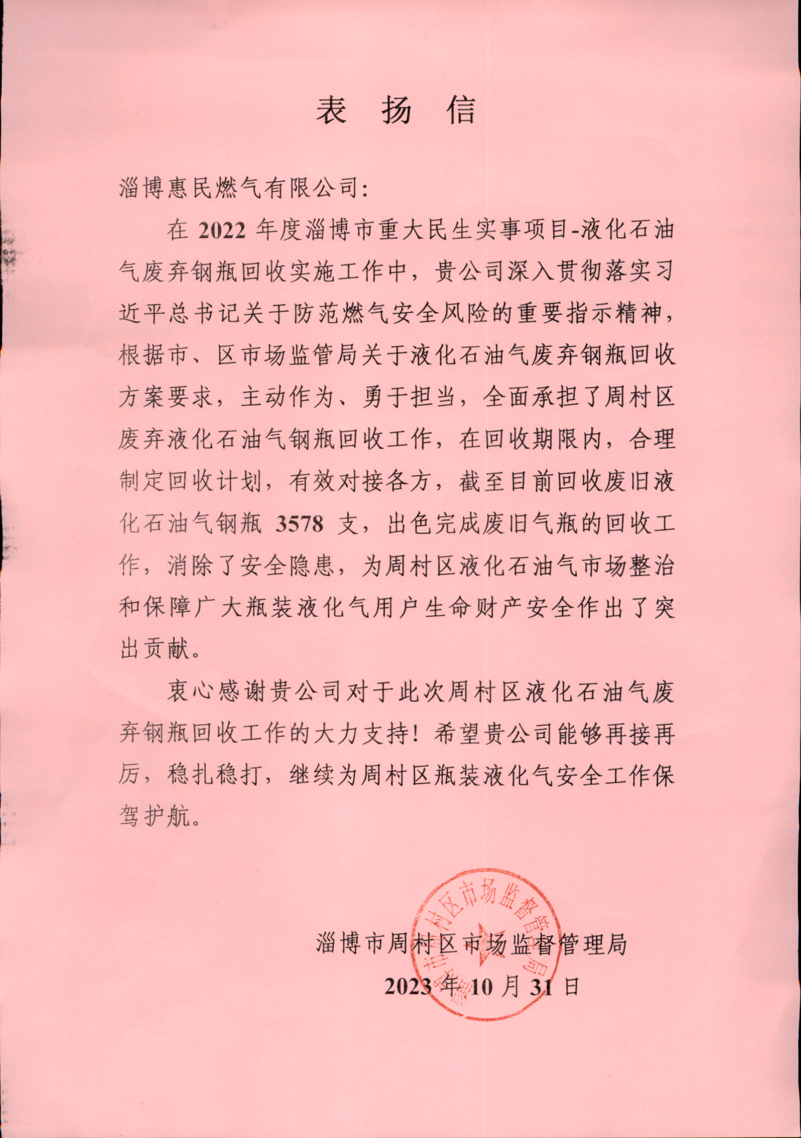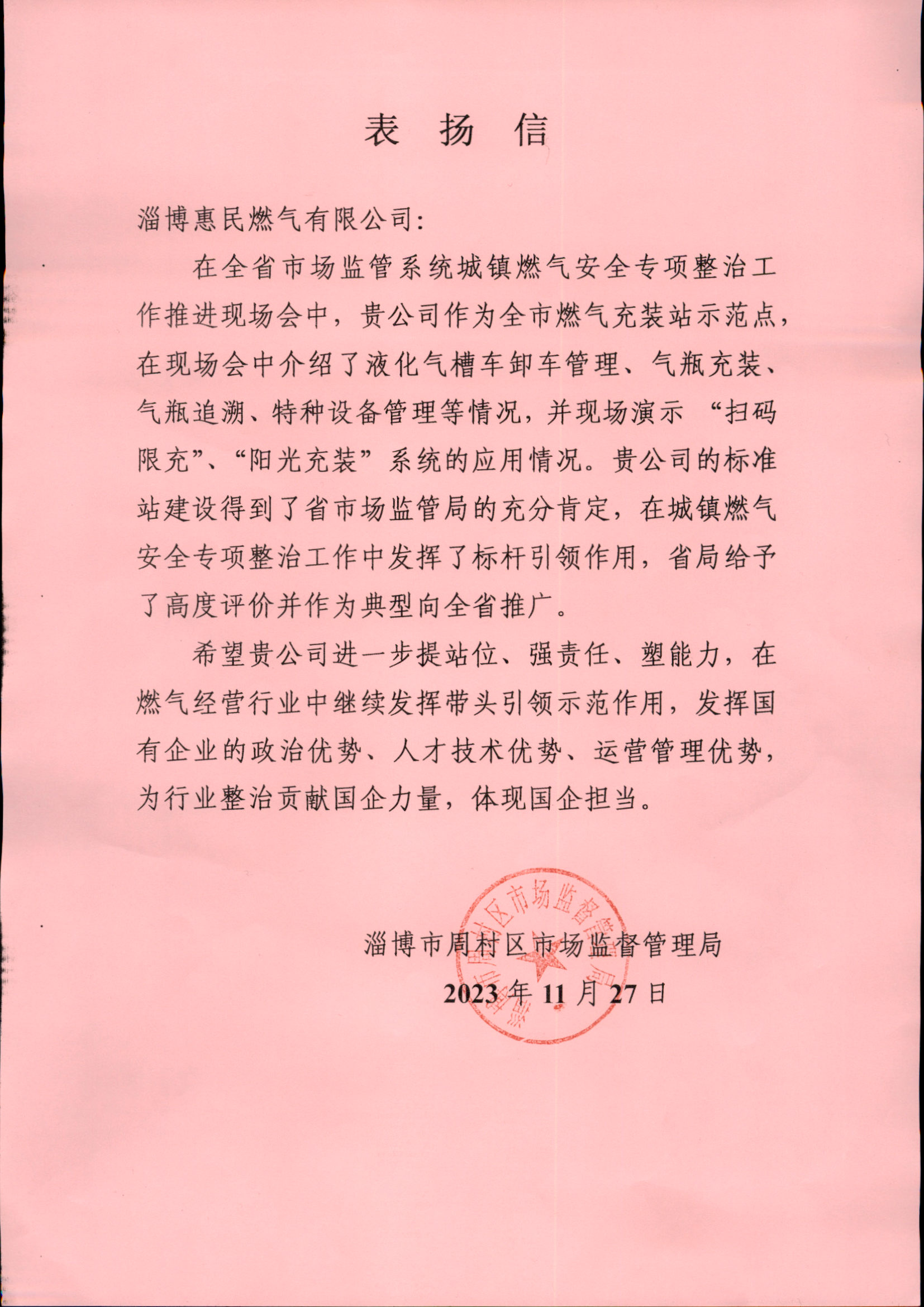 11月27日,淄博市周村區(qū)市場監(jiān)督管理局專程到淄博惠民燃?xì)庥邢薰舅腿ケ頁P(yáng)信,對惠民燃?xì)庠谌∈袌霰O(jiān)管系統(tǒng)城鎮(zhèn)燃?xì)獍踩珜m椪喂ぷ魍七M(jìn)現(xiàn)場會和作為全市重大民生實事項目的液化石油氣廢棄鋼瓶回收工作中作出的突出貢獻(xiàn)表示感謝,并充分肯定了惠民燃?xì)庠谝夯蜌庑袠I(yè)中的引領(lǐng)示范作用。